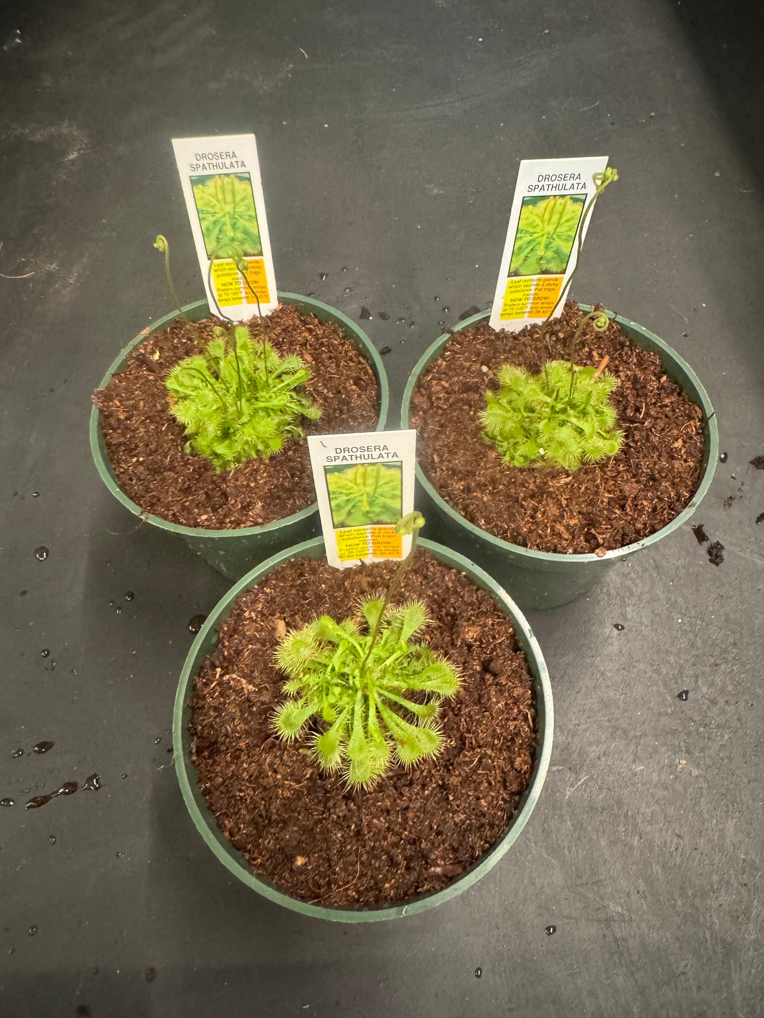Drosera Spathulata The plant then through absorption uses the nutrients from the decomposing bug to feed itself. The pot has holes in bottom, we recommend placing pot in tray of water once weekly or as the top of moss dries out. The humidity dome will provide humidity until you find a new home like a terrarium/aquarium works well or just something you can gather humidity in. We generally replant them into their new homes using sphagnum moss or peat and perlite mix 50/50.