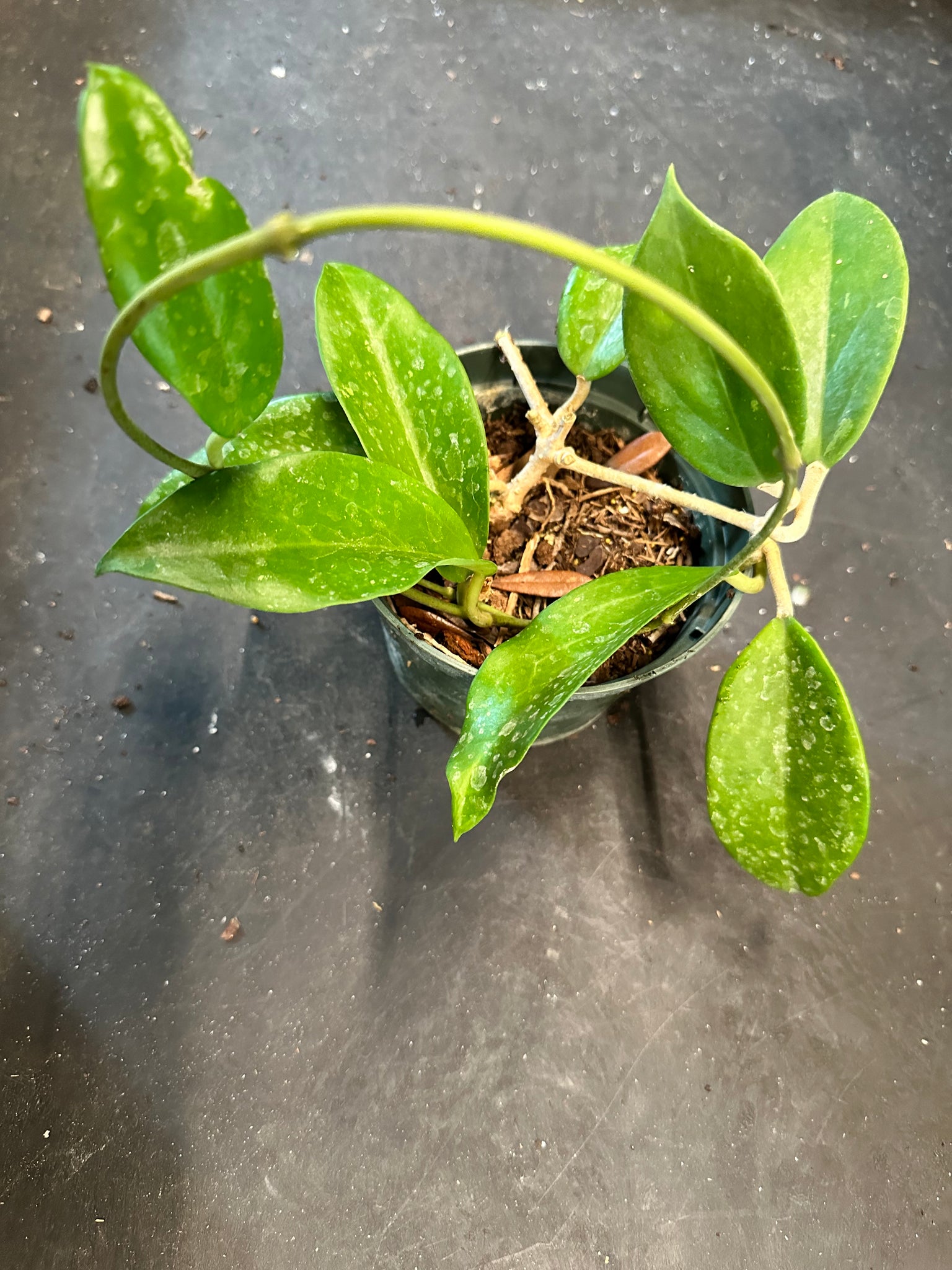 Hoya Arnottiana has thick succulent like leaves with some veining. The flowers are bundles of creamy white petals and corona centered in a start of yellow.