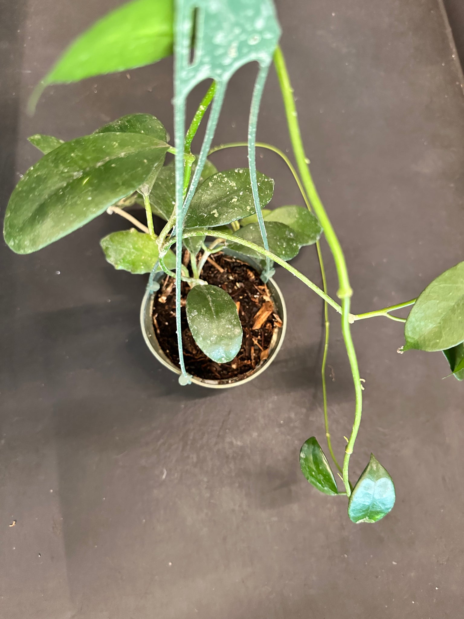 Hoya Diversifolia has very diverse leaf growing pattern. Overall the leaves are thick and leathery with some leaves being dimpled, some will be veiny and other will be smooth all on the same plant....very diverse. The flowers are bundles of pale yellow petals that have a pink pearly tinge. The corona is dark pink with a pin point pale yellow center. Plant is rooted in a 5” hanging basket.