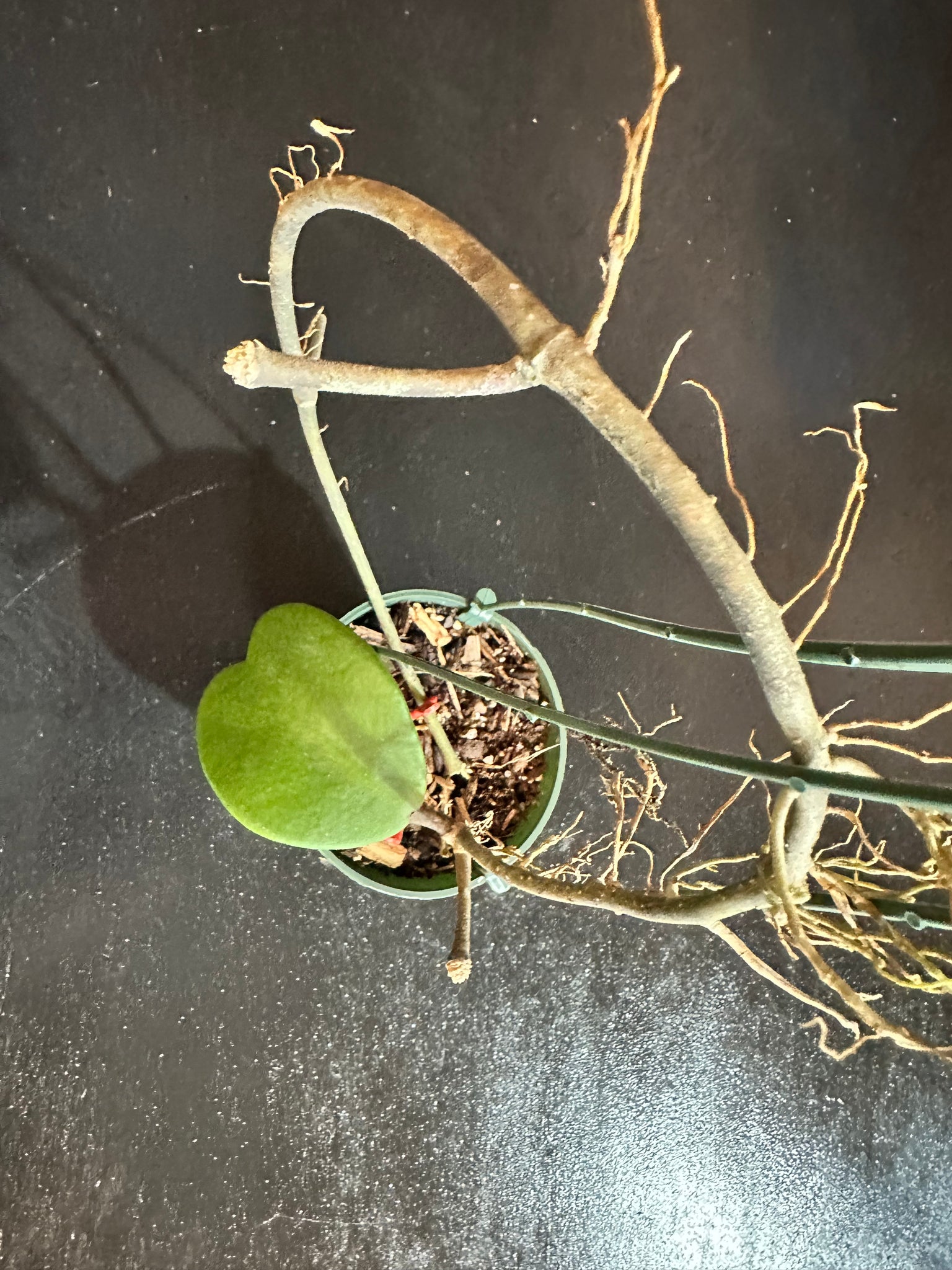 Hoya Kerrii 'fuzzy' has heart shaped thick green succulent like leaves that have a fuzzy pubescense on both sides of the leaf. The blooms are clusters of pale pink to white petals centered in a corona of dark and light pink. This plant has 2 active peduncles.