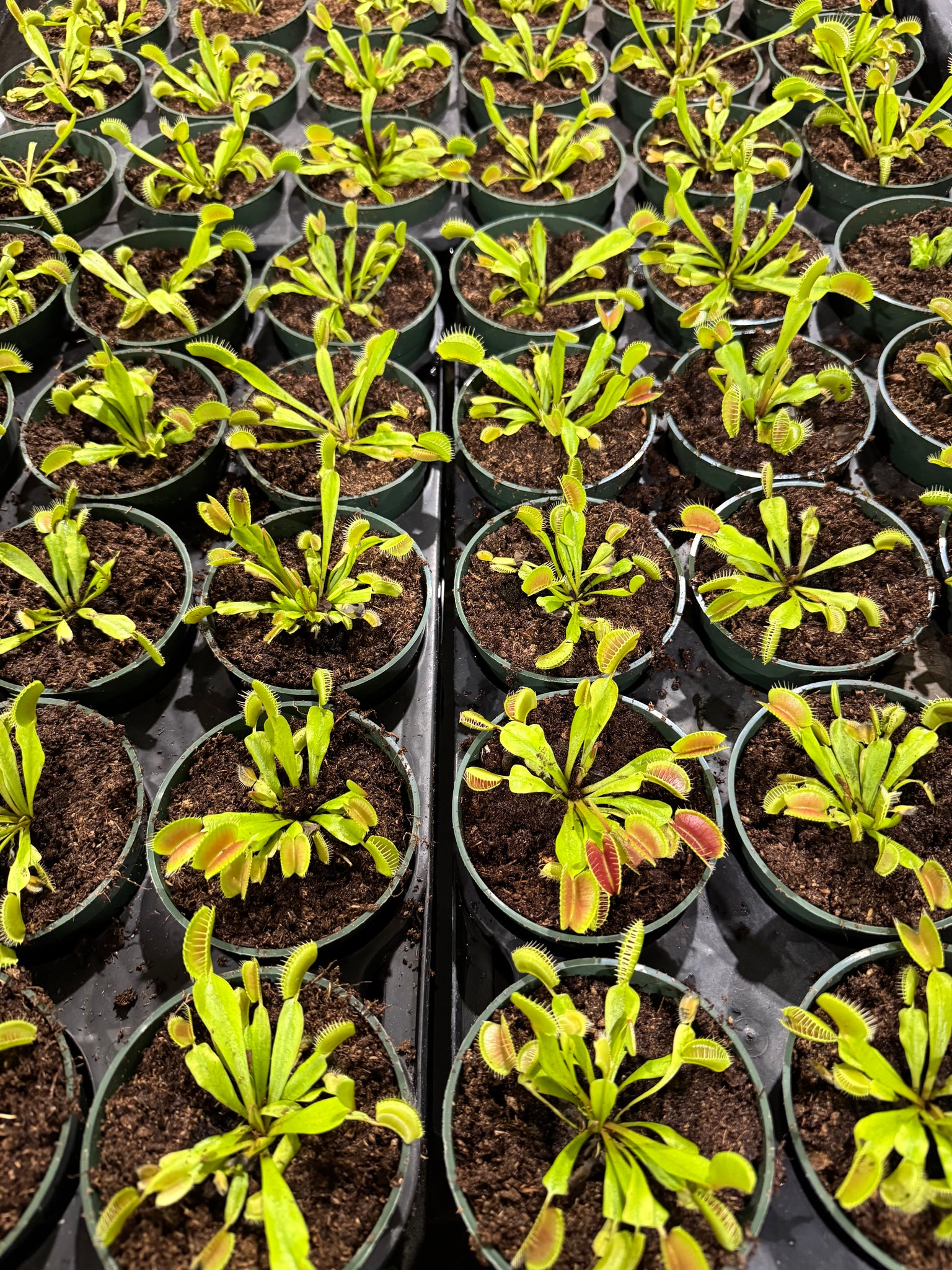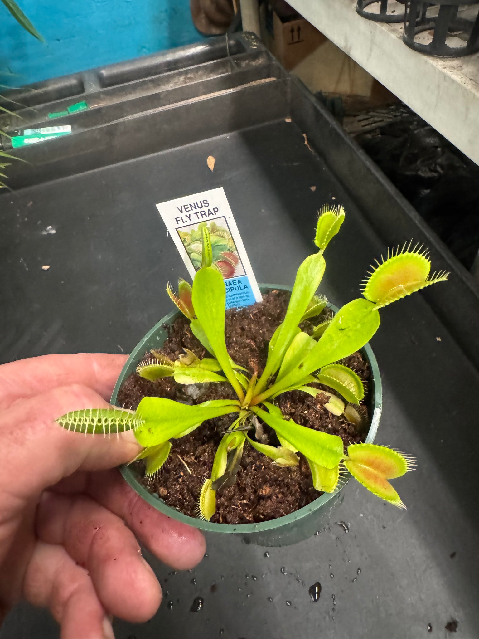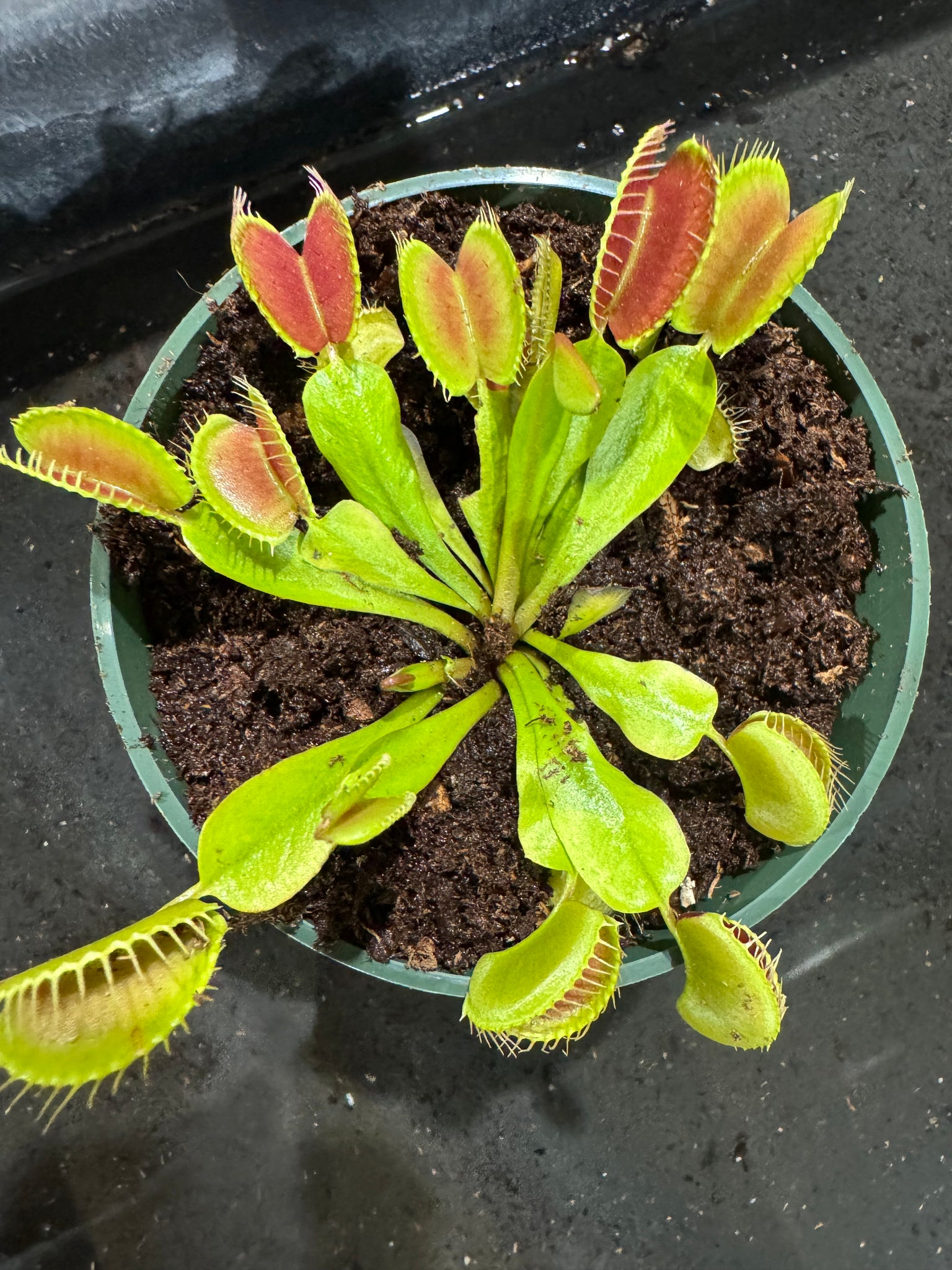 The Muscipula Venus Fly Trap variety has green leaf blades with traps that are green outside and have a deep red hue inside the traps. The traps will grow to about 1.5" with the overall plant growing 4-5" tall with a spread of 6-8". We recommend placing pot in tray of water and add water to the tray as the top of moss dries out or you can use a terrarium/aquarium set up. We generally replant them into their new homes using a mix of 50/50 peat and perlite or sphagnum moss. If sphagnum moss is used be careful of root rot. We do not recommend the use of substrates containing fertilizers because it can burn the roots.